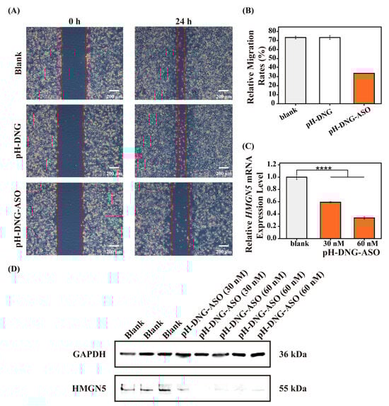 Additionally, to evaluate the efficiency of ASOs on downstream biological processes, we performed a scratch wound healing assay on MDA-MB-231 cells. MDA-MB-231 cells were subjected to a straight scratch and treated with PBS, pH-DNG, and pH-DNG-ASO (60 nM), respectively. As shown in Figure 4A,B, in both PBS and bare pH-DNG control groups, the scratch gap was nearly closed after 24 h. Conversely, the scratch in the pH-DNG-ASO-treated group remained open, suggesting that pH-DNG-ASO exerted a strong inhibitory effect on cell migration. We further quantified the expression level of HMGN5 mRNA in MDA-MB-231 cells after incubation with pH-DNG-ASO for 48 h via qRT-PCR. Figure 4C showed that HMGN5 mRNA downregulation was near 70% when cancer cells were incubated with pH-DNG-ASO (60 nM ASOs). Since the HMGN5 gene is closely associated with the metastasis and proliferation of breast tumor cells, both assays showed an efficient inhibition of gene expression of HMGN5 in terms of cell behavior and mRNA levels. To further validate the downregulation of HMGN5 at the protein level, Western blot analysis revealed a marked decrease in HMGN5 protein levels in cells treated with pH-DNG-ASO (60 nM) compared to the untreated control group (Figure 4D and Figure S17). These findings demonstrate that pH-DNG-ASO effectively inhibits HMGN5 expression at both the transcriptional and translational levels.