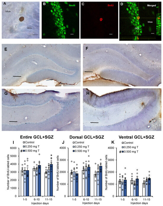 Quantification of the number of BrdU-labeled cells in the granule cell layer and subgranular zone of the dentate gyrus of adult male rats. Photomicrographs are shown for (A) a representative BrdU-labeled cell collected using bright-field microscopy (Zeiss Axio Imager D1; 100× Achrocplan oil-immersion lens, 1.25 NA) and (B–D) a cell double-labeled with BrdU and NeuN collected using confocal microscopy (Olympus Fluoview 3000; 60× UPlanApo oil-immersion lens, 1.5 NA). Representative photomicrographs from rats in the 10–15 day injection groups are also shown for (E) dorsal and (G) ventral sections taken from a subject injected with 0.500 mg T and for (F) dorsal and (H) ventral sections taken from a subject injected with oil. The scale bar represents 10 μm for (A–D) and 200 μm for (E–H). Graphs depict mean ± SEM number of BrdU-labeled cells estimated based on cell counts, with data for individual rats shown as circles. (I) For the entire dentate gyrus, there was a significant effect of testosterone dose (# p = 0.029), with more labeled cells in the GCL+SGZ of the 0.500 mg T group than in either of the other two groups (both p < 0.04) and no difference between the 0.250 mg T group and the control group. There was no significant effect of hormone injection day and no dose×day interaction. Analyses within the 5-day blocks indicated that the effect of testosterone was only significant on days 11–15 (* p = 0.006). (J) For the dorsal dentate gyrus, there was no significant effect of testosterone dose and no interaction effect (p = 0.36), but there was a nearly significant effect of hormone injection day (p = 0.084). (K) For the ventral dentate gyrus, there was a significant effect of dose (# p = 0.037), with more labeled cells in the ventral GCL+SGZ of the 0.500 mg T group than that of the 0.250 mg T group (p = 0.011). There was also a marginal difference between the 0.500 mg T group and the control group (p = 0.067). There was no significant effect of hormone injection day and no dose × day interaction.