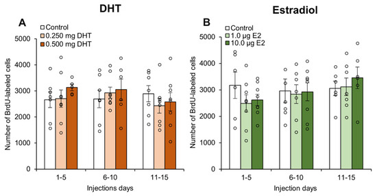 Mean (±SEM) number of BrdU-labeled cells in the granule cell layer and subgranular zone of the dentate gyrus of adult male rats, with data for individual rats shown as circles. (A) There were no significant effects of daily DHT injections, and (B) there was also no significant effect of daily estradiol injections. In both experiments, there was no significant effect of the day of injection and no significant interaction effect.