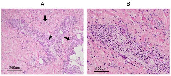 Skin biopsy findings with hematoxylin and eosin staining. (A) Eosinophilic infiltration is observed not only around the blood vessels (arrowhead) but also extensively within the collagen fibers and interstitial tissue (arrows). (B) Eosinophil-predominant inflammatory cell infiltration is evident within the vascular wall.