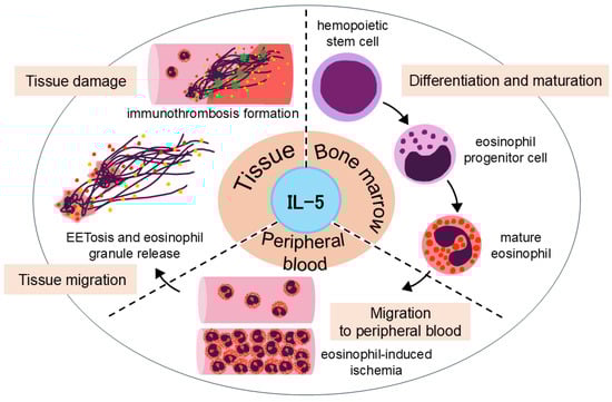 IL-5 is a cytokine of critical importance that exerts multifaceted effects on the life cycle of eosinophils (Figure 2). IL-5 contributes to eosinophil differentiation and maturation in the bone marrow, migration to peripheral blood and tissues, and the prolongation of eosinophil survival [,,,].