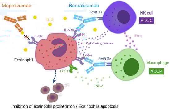 Furthermore, benralizumab promotes antibody-dependent cellular phagocytosis (ADCP) through FcγRIIIa on macrophages. NK cells activated by benralizumab release interferon (IFN)-γ, which stimulates tumor necrosis factor (TNF)-α secretion from macrophages. TNF-α binds to TNF receptor 1 expressed on eosinophils, inducing eosinophil apoptosis and consequently enhancing ADCP. Through these immune cell interactions involving NK cells, macrophages, and eosinophils, benralizumab effectively depletes eosinophils, leading to their near-complete depletion []. (Figure 3). In in vitro experiments, benralizumab strongly promoted ADCC and ADCP; however, complement-dependent cytotoxicity activity was not observed, presumably due to insufficient activation of the complement system []. Importantly, in vitro experiments have shown that eosinophil granules such as eosinophil cationic protein and eosinophil-derived neurotoxin are not released during benralizumab-induced eosinophil apoptosis, supporting the safety profile of benralizumab [].