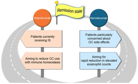 Regarding the combination of anti–IL-5 biologics and ISs, a post hoc analysis of the MIRRA trial demonstrated that mepolizumab was effective regardless of baseline IS use, including agents such as azathioprine and mycophenolate mofetil []. In contrast, a subgroup analysis of the MANDARA trial suggested that the remission rate with benralizumab appeared to be higher in patients without baseline IS use than in those receiving ISs at baseline []. However, given the small sample size and the major limitations previously noted in the MANDARA trial, this finding should be interpreted with caution. Currently, there is no established evidence regarding the concomitant use of these two IL-5–targeted agents with ISs. Nevertheless, as such combinations may have clinical implications for patient outcomes in real-world practice, the generation of further evidence is critically needed.