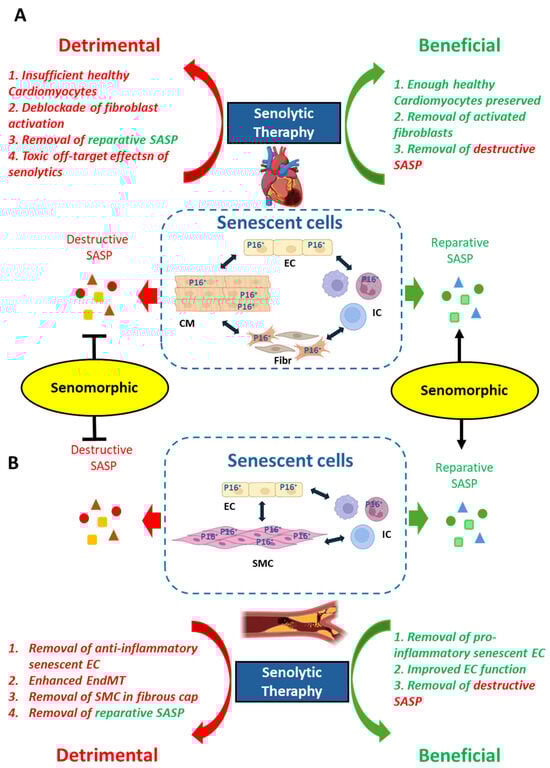 Illustration of the mechanisms of beneficial and detrimental effects exerted by anti-senescence therapy in heart disease (A) and atherosclerotic vascular disease (B). Anti-senescence therapies include senolytic and senomorphic therapy. While senolytic agents selectively eliminate senescent cells, senomorphic compounds eliminate the detrimental effects of senescent cells by targeting SASP (suppressing destructive while preserving reparative SASP). Details are discussed in the text of the article. EC, endothelial cell; CM, cardiomyocyte; IC, immune cell; Fibr, fibroblast; SMC, smooth muscle cell; SASP, senescence-associated secretory phenotype; EndMT, endothelial–mesenchymal transition.
