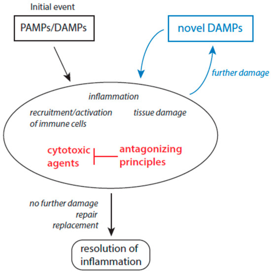 Roles of molecular patterns, tissue damage, and cytotoxic agents during inflammation. The further fate of inflammation depends on the individual state of protective mechanisms to antagonize cytotoxic agents. Resolution of inflammation is induced when no further damage occurs. As long as novel DAMPs are released from undergoing immune and tissue cells at inflammatory sites, the inflammation persists (presented in blue). Abbreviations: DAMPs—damage-associated molecular patterns and PAMPs—pathogen-associated molecular patterns.