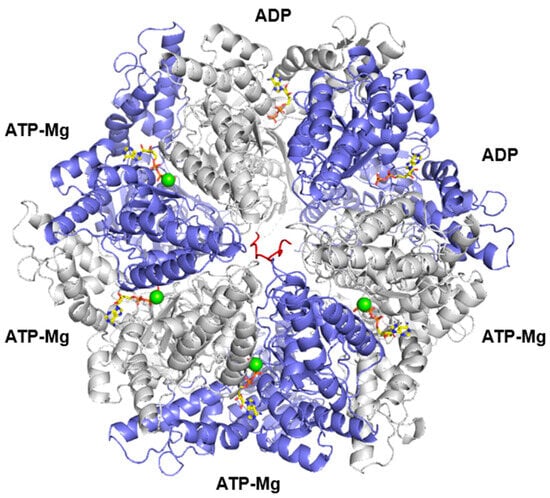 Figure 1. Three-dimensional structure of the hexameric LONP1 complex. Chains A, C, E are shown in white, whereas chains B, D, F are in violet; the enzyme is shown complexed with poly-alanine (red), according to 7kms.pdb. ATP and ADP in yellow sticks, whereas Mg are in green spheres.