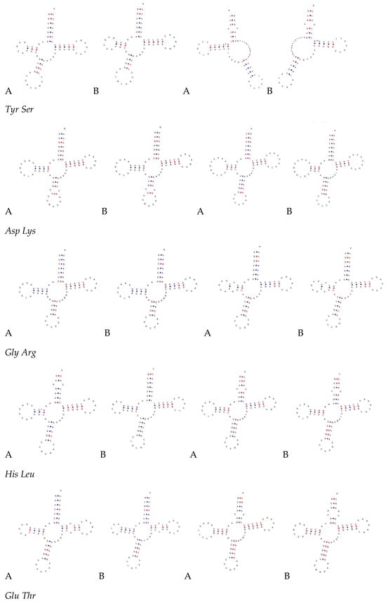 - Lowe, T.M.; Chan, P.P. tRNAscan-SE on-line: Integrating search and context for analysis of transfer RNA genes. Nucleic Acids Res. 2016, 44, W54–W57. [Google Scholar]