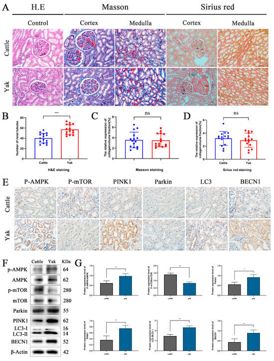 Kidney samples from adult yaks and yellow-cattle were fixed in 4% PFA for one week. Subsequently, the samples were cut into 1 cm3 pieces, dehydrated for 24 h, embedded in paraffin, and sectioned into 4 μm-thick paraffin sections. Deparaffinization of these sections was achieved using xylene and alcohol in preparation for histological staining. H&E, Masson and Sirius red staining were performed following the instructions provided by the relevant reagent manufacturer (Solarbio, Beijing, China). We selected at least five slices from each group of samples. For every slice, three fields of view were randomly chosen, and photographs were taken using an Olympus-DP73 optical microscope (Olympus, Tokyo, Japan). To quantify collagen volume after Masson’s trichrome or Sirius red staining, we utilized Image-J 1.54software (National Institutes of Health, Bethesda, MD, USA) to analyze the percentage of the stained area in each randomly selected field of view relative to the total area. Importantly, all sample analyses were conducted in a blinded manner.