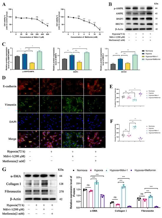 29]. This process is characterized by a decrease in E-cadherin expression and an increase in Vimentin, α-SMA, and FN1 expression. Our study found that under chronic hypoxia, mitophagy activation effectively inhibited the expression of Vimentin, α-SMA, Collagen Ⅰ, and FN1, suggesting that mitophagy may play a protective role in EMT progression and renal fibrosis. This result is consistent with previous studies. Multiple studies have confirmed that mitophagy not only alleviates hypoxia-induced renal fibrosis but also has therapeutic effects on other kidney diseases. For instance, Mdivi-1, a mitochondrial inhibitor, can reduce the expression levels of PINK1, PARK2, and LC3II, activate the TGF-β1 signaling pathway in HK-2 cells under hypoxic conditions, thereby exacerbating renal fibrosis [
