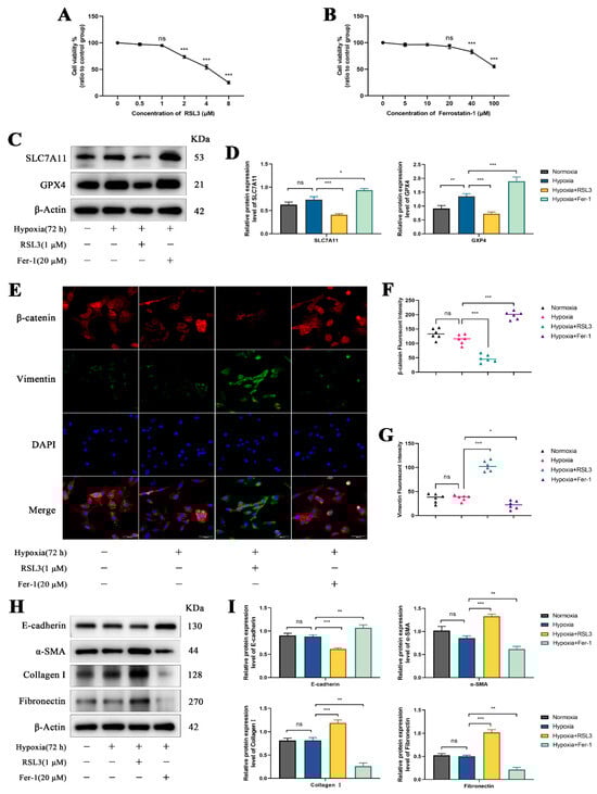 34]. This change prevents the effective clearance of lipid peroxides, ultimately inducing ferroptosis. Concurrently, oxidative stress triggered by ferroptosis can activate the NF-κB signaling pathway, leading to the release of pro-inflammatory factors such as interleukin-6 (IL-6) and tumor necrosis factor-alpha (TNF-α). These inflammatory factors further stimulate the TGF-β1 pathway, inducing EMT and thereby accelerating fibrosis progression. However, our study revealed that yak RTECs did not exhibit an enhanced trend of ferroptosis under chronic hypoxia and maintained normal expression of SLC7A11 and GPX4. Notably, when ferroptosis was modulated in yak RTECs using RSL3 (ferroptosis inducer) or Ferrostatin-1 (ferroptosis inhibitor), EMT and fibrosis were, respectively, promoted or inhibited. These findings suggest that the hypoxic adaptation mechanisms in yaks effectively suppress hypoxia-induced ferroptosis, thereby mitigating renal fibrosis progression.