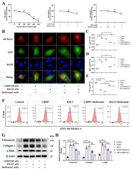 In the drug treatment experiments, RTECs were seeded into 96-well plates. After hypoxia induction for 48 h, cells were treated with specific drugs at varying concentrations to evaluate their effects under hypoxic conditions. The drugs included Mdivi-1 (mitophagy inhibitor, Med Chem Express): 0, 25, 50, 100, 200, 400, and 800 µM; Metformin (mitophagy activator, Med Chem Express): 0, 1, 2, 4, 8, 16, and 32 mM; RSL3 (ferroptosis activator, Med Chem Express): 0, 0.5, 1, 2, 4, and 8 µM; Ferrostatin-1 (ferroptosis inhibitor, Med Chem Express): 0, 5, 10, 20, 40, and 100 µM; and Cisplatin (renal fibrosis activator, Med Chem Express): 0, 5, 10, 20, 40, 80, and 100 µM. Following the drug treatment, cells were maintained under hypoxic conditions for an additional 24 h. The CCK-8 assay was used to assess cell viability, and the results were analyzed to determine the optimal concentrations of each drug for subsequent experiments.