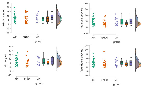 Comparison of follicle number and oocyte quantity and quality among MF, AIF, and ENDO groups. The panels represent the number of follicles, number of retrieved oocytes, number of mature oocytes (metaphase II), and number of fecundated oocytes, evaluated in the three groups. Each raincloud plot shows raw data points, box plots (displaying median and interquartile range), and a violin plot (showing the kernel density estimate), thereby providing a comprehensive view of the data distribution, central tendency, and variability. Each color corresponds to one of the three specific groups, with the same color scheme consistently applied to the raw data points, box plots, and violin plots to maintain visual coherence. The density plot suggests a high degree of superimposition among the three groups, indicating overlapping distributions. No significant differences among the three groups (AIF, ENDO, and MF) were observed, using one-way ANOVA.
