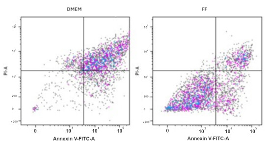 Annexin V-PI Apoptosis essay on GCs. GCs were cultured in the absence (CM) or presence of FF from AIF, ENDO, or MF patients for 14 days, collected, stained with Annexin V/PI, and measured by flow cytometry, as described in Materials and Methods. The panel of FF represents all the different treatments (FF-AIF, FF-ENDO, FF-MF). The figure is representative of 3 separate experiments for each group of GCs. Coloured dots represent cells, in particular the Lower Left Panel (Annexin V−, PI−) represents viable cells, or cells negative for both stains and not undergoing apoptosis or necrosis; the Lower Right Panel (Annexin V+, PI−) represents Early apoptotic cells, positive for Annexin V but negative for PI, presenting externalized, phosphatidyl serine (PS) but still intact membrane; the Upper Right Panel (Annexin V+, PI+) for Late apoptotic or necrotic cells with PS externalization and compromised membrane; the Upper Left Panel (Annexin V−, PI+) for the Necrotic cells with mechanical damage, compromised membrane but withoue PS exposure, i.e., negative for Annexin V, positive for PI.