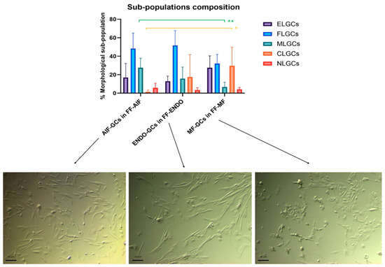 Comparison among the sub-population components in the three groups incubated in CM added with the corresponding FF. GCs from AIF (AIF-GCs), ENDO (ENDO-GCs) or MF (MF-GCs) were incubated in CM added with FF from AIF (FF-AIF), ENDO (FF-ENDO) or MF (FF-MF) for 21 days. Morphology was evaluated by two different expert biologists by analyzing 10 different fields/plates. The number of the different morphological cells was reported and represented as a percentage. A total of 200 cells/samples were evaluated and expressed as percentage mean value ± SD. The figure is representative of six separate experiments for each group. ELGCs: epithelial-like granulosa cells; FLGCs: fibroblast-like granulosa cells; MLGCs: muscle-like granulosa cells; CLGCs: chondroblast-like granulosa cells; NLGCs: neuronal-like granulosa cells. Statistical differences were assessed by comparing for the three groups the effects of the three FF treatments (FF-AIF, FF-ENDO, and FF-MF) on GC morphological differentiation (ELG, FL, ML, CL, and NL). * p = 0.042 and ** p = 0.006 indicate statistical significance based on Tukey’s post hoc test after ANOVA, comparing “AIF-GCs in FF-AIF” vs. “MF-GCs in FF-MF”. Scale bar = 10 μm.