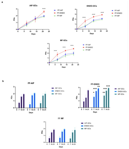 Population replications. Cells were seeded in a 12-well plate, incubated in the presence of CM added with FF-AIF, FF-ENDO, or FF-MF, and let grow. After 7, 14, and 21 days, the cells were harvested and counted as above described. The number of population doublings (PDs) is calculated from the formula PDs = (logNT − logNo)/log2, where NT is the number of cells recovered during harvesting at time T, and No is the number of cells originally plated. Values are expressed as mean ± SD of six separate experiments. (a) Graphical representation of the PDs curve obtained by GCs belonging to each group.in the presence of different FF-CM. *** p < 0.0001, Tukey’s post hoc test, comparison FF-ENDO vs. FF-AIF and FF-MF at respective times. (b) Graphical representation of the PD curve obtained by each FF-CM on the three different groups of GCs. ▲ p < 0.05; ▲▲ p < 0.01, ▲▲▲ p < 0.001, Tukey’s post hoc test, comparison AIF-GCs vs. ENDO-GCs, and AIF-GCs vs. MF-GCs, at respective times.