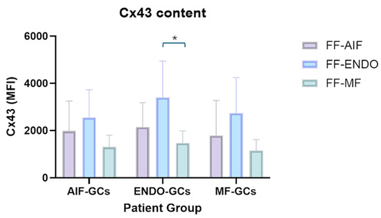 Effect of FF-AIF, FF-ENDO, and FF-MF on AIF-GCs, ENDO-GCs, and MF-GCs- Cx43 content. GCs, recovered as described in Materials and Methods, were incubated in the presence of CM supplemented with FF from each patient group for 21 days. Cells were detached, washed, fixed, permeabilized, and labeled with anti-Cx43 antibody, following customer guidelines. Fluorescence was recorded by flow cytometry and expressed as MFI mean values ± SD of six separate experiments. * p < 0.05, Tukey’s post hoc test.