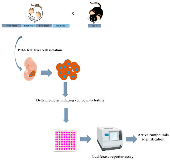To identify drugs capable of enhancing delta globin gene expression, we developed two ex vivo models using murine foetal liver cells isolated at 14.5 days post-coitum (dpc). These cells were derived from transgenic mouse models crossed in homozygosity with a p53 knockout background, as previously described [11]. The generated cells represent a physiological analogue of an erythroid progenitor in terms of transcriptional regulation and proper erythroid differentiation [15]. For the first cell model, we used transgenic mouse lines containing the constructs HS2δFLβRL and HS2CACCCδFLβRL, which were created by our laboratory and previously described [6] (Figure S1).