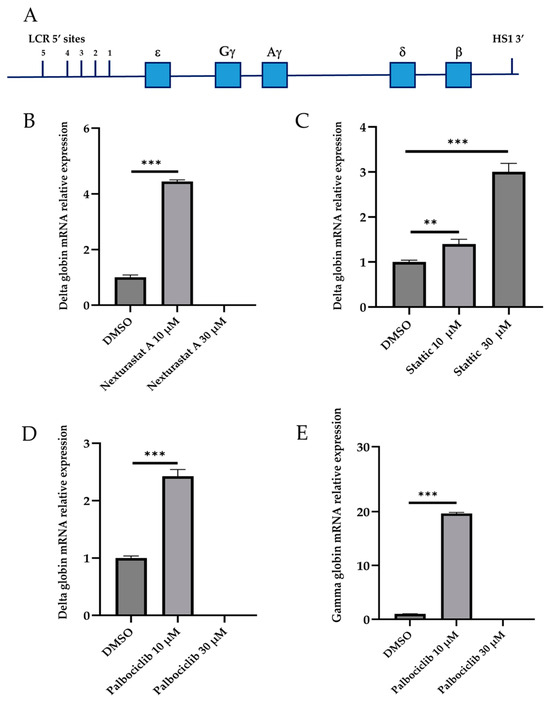 As illustrated in Figure 5D, treatment with Palbociclib significantly increased delta globin gene expression at 10 μM, with a fold change of 2.42 ± 0.11 (p = 0.0005) when compared to the control. Furthermore, Palbociclib induced a remarkable increase in gamma globin gene expression at the same concentration, reaching a 19.66 ± 0.19-fold change (p = 2.07 × 10−7; Figure 5E). Similar to Nexturastat, cytotoxic effects were noted at 30 μM. None of the tested compounds significantly affected beta globin mRNA levels.