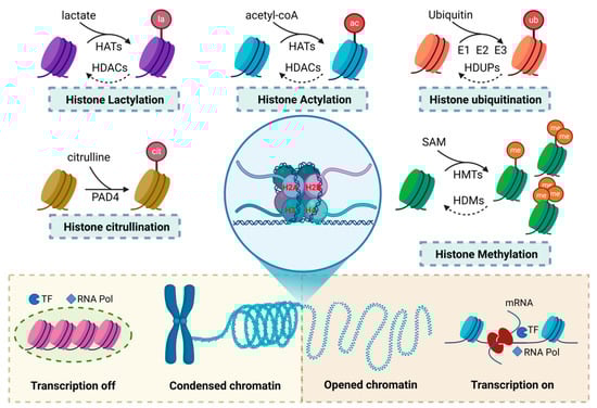 Types of histone modifications and their impact on chromatin structure and transcriptional regulation. This figure presents the common types of histone modifications and their effects on chromatin structure and transcriptional regulation. The modifications include lactylation, citrullination, acetylation, ubiquitination, and methylation. These modifications modify the chemical properties of histones by adding or removing specific chemical groups, which, in turn, influence the chromatin structure. Some histone modifications promote chromatin compaction, preventing the binding of transcription factors and RNA polymerase (RNA Pol), thereby facilitating transcriptional repression. In contrast, other modifications promote chromatin relaxation, enabling transcription factor and RNA polymerase binding to activate transcription.