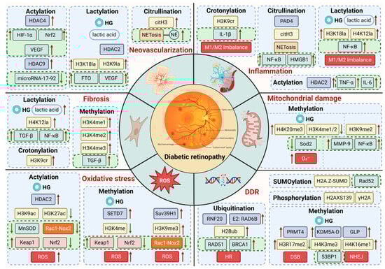 The inner circle of the diagram depicts the pathological events triggered by hyperglycemia—such as oxidative stress, inflammation, and angiogenesis—that drive the development of DR. The outer circle illustrates how histone modifications regulate gene expression, thereby influencing the progression of DR.