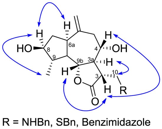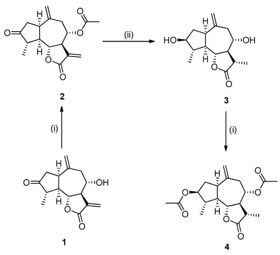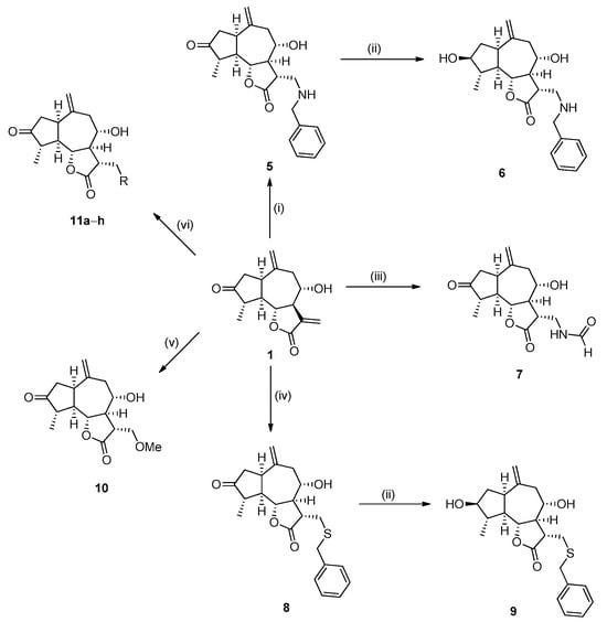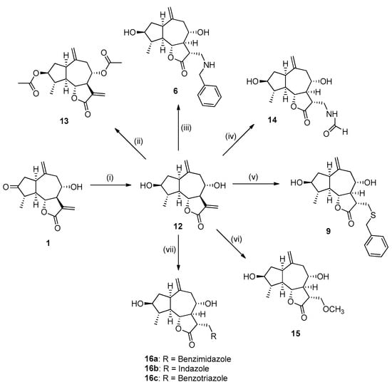 - Kulyyasov, A.T.; Adekenov, S.M.; Seitembetov, T.S.; Rakhimov, K.D. Chemical Modification of Grosshemin in the Lactone Ring. Chem. Nat. Compd. 1995, 31, 192–195. [Google Scholar] [CrossRef]