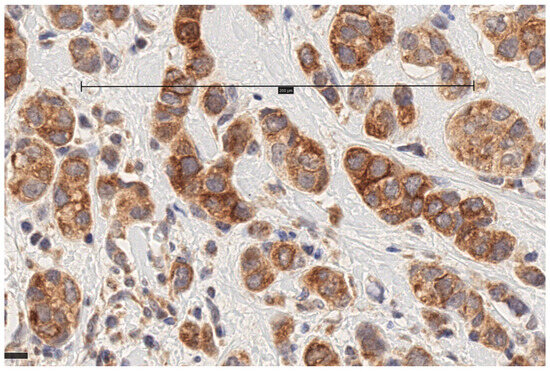 Invasive ductal carcinoma with moderate cytoplasmic staining (scale bar: 200 μm).