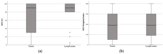 Box plots of the MT1 expression (a) and weighted index (b) in the tumor and metastasized lymph nodes.