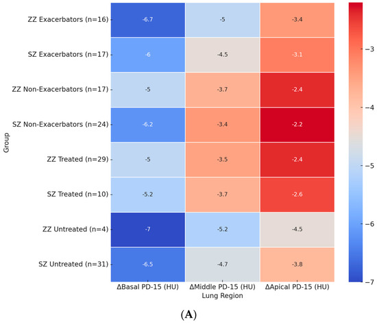 Figure 2A illustrates the regional distribution of annual PD-15 loss across different patient subgroups. The most pronounced basal PD-15 decline was observed in untreated ZZ patients (−7.0 HU), which was significantly greater than in untreated SZ patients (−6.5 HU, p = 0.028). A similar pattern was observed in the middle and apical lung regions, where untreated ZZ patients exhibited a greater decline (−5.2 HU and −4.5 HU, respectively) compared to untreated SZ patients (−4.7 HU and −3.8 HU).