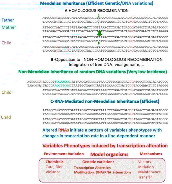 The Mendelian heredity mediated by DNA ensures the stability of the species’ memory. This information is affected by rare and irreversible changes (1 error per 1 to 10 million cell divisions) in the structure and random distribution of chromosomes during meiosis []. Figure 1 shows different modes of inheritance, genetic with DNA variation and RNA-mediated non-Mendelian without.