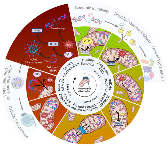 Due to the complex interplay of factors contributing to aging, untangling the definitive starting point remains challenging. Even so, genomic instability is widely regarded as a central component, exacerbating early vulnerabilities and propagating them into aging hallmarks [3,4]. Accumulated mutations caused by exogenous and endogenous oxidizing agents, as well as DNA replication and repair errors, all contribute to genomic instability, compromising the blueprint of cellular components and organelles [5,6]. These mutations jeopardize the production of cellular components and increase cellular waste [7,8]. Telomere attrition further contributes to this, as it limits the cellular replicative capacity, thereby contributing to tissue aging by slowing the influx of new cells and instead favoring senescence [9,10]. In keeping with this, epigenetic alterations lead to dysregulated gene expression, blunting the cell’s ability to respond to stimuli by transcribing and translating nuclear DNA into functional proteins and maintaining protein homeostasis [11,12]. The loss of proteostasis is further exacerbated not only by the damage or misassembly of proteins essential for cellular repair and maintenance but also by a broader decline in (macro)autophagy [13,14,15]. Over time the compounded effects of the primary aging hallmarks manifest in age-associated phenotypes and diseases. For example, genomic instability promotes the onset of cancer, while the epigenetically driven loss of proteostasis and impaired macroautophagy favor the accumulation of misfolded proteins, contributing to neurodegenerative diseases such as Alzheimer’s [16,17]. Notably, mitochondrial dysfunction has been identified as both a causal and modifiable factor in nearly all chronic diseases associated with aging [18,19,20,21]. While mitochondrial dysfunction in this framework can be viewed as a consequence of primary aging hallmarks, here, we challenge this view, and position mitochondrial dysfunction at the center of aging and the development of age-related pathologies.