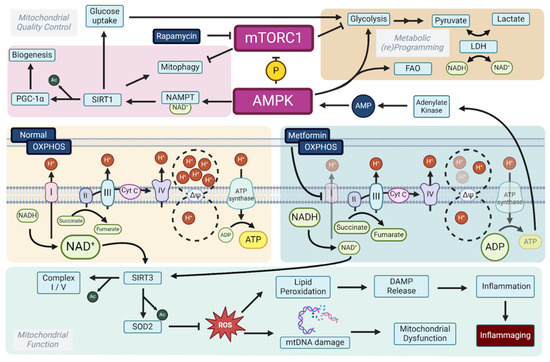 Metabolic and mitochondrial mechanisms of rapamycin and metformin in aging. Metformin and rapamycin promote longevity through distinct but complementary mechanisms. Rapamycin inhibits mTORC1, mimicking starvation and activating catabolic processes, such as mitophagy and mitochondrial biogenesis, via PGC-1α and SIRT1. Metformin, through partial complex I inhibition, lowers ATP levels and increases AMP, activating AMPK, which enhances NAD+ salvage pathways (via NAMPT) and promotes mitochondrial quality control. Metformin also shifts metabolism toward glycolysis by increasing lactate dehydrogenase (LDH) activity, thereby sustaining NAD+ levels. Additionally, both drugs inhibit mTORC1, reinforcing their shared role in energy regulation. Metformin reduces reactive oxygen species (ROS) formation, limiting lipid peroxidation and mitochondrial DNA (mtDNA) damage, thereby mitigating inflammaging. The synergistic effects of these drugs highlight their potential as longevity-promoting interventions.