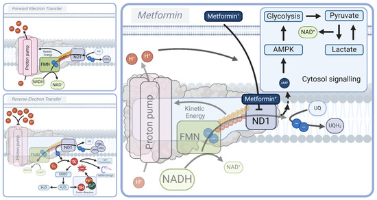 Metformin’s modulation of Complex I and mitochondrial metabolism. Metformin exerts its effects through the partial inhibition of the ND1 subunit of Complex I, preventing excessive electron backlogging and reducing reverse electron transfer (RET)-induced reactive oxygen species (ROS) production. This modulation lowers the proton motive force and ATP production, promoting glycolysis and increasing NAD+ levels via lactate dehydrogenase (LDH) activity. Elevated NAD+ enhances sirtuin activity, improving mitochondrial quality control and reducing inflammasome activation. Additionally, reduced ATP levels increase the AMP/ATP ratio, activating AMPK and promoting beneficial downstream effects, including autophagy, mitochondrial biogenesis (via PGC-1α), and antioxidant upregulation (via NRF2). Unlike potent Complex I inhibitors like rotenone, metformin’s self-limiting accumulation prevents excessive mitochondrial dysfunction, aligning with the hormesis theory by eliciting mild stress that enhances cellular resilience and longevity.