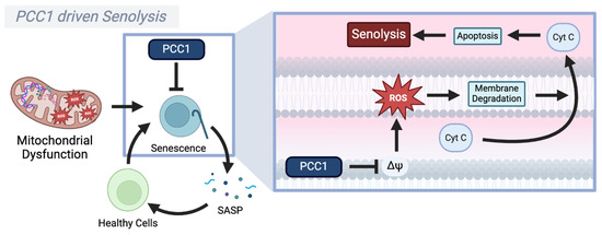 PCC1-induced senolysis through mitochondrial dysfunction. (Left) Mitochondrial dysfunction contributes to cellular senescence, leading to the secretion of senescence-associated secretory phenotype (SASP) factors, which further promote senescence in surrounding cells. PCC1, a senolytic compound, selectively targets senescent cells to induce apoptosis while reducing SASP-associated inflammation. (Right) PCC1 disrupts the mitochondrial membrane potential (ΔΨm), leading to excessive reactive oxygen species (ROS) production and mitochondrial membrane degradation. This results in cytochrome C (Cyt C) release, which triggers apoptosis and senolysis, effectively clearing the senescent cells. Through this mechanism, PCC1 may alleviate inflammaging and promote mitochondrial homeostasis.