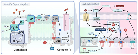 Respiratory Complex III–cytochrome C–Complex IV supercomplex in mitochondrial function and dysfunction. (Left) Under normal conditions, Complex III transfers electrons from reduced ubiquinol (UQH2) to cytochrome C (Cyt C), which, in turn, donates electrons to Complex IV, where oxygen (O2) is reduced to water (H2O). This process contributes to the proton-motive force (PMF) by translocating protons (H+) across the inner mitochondrial membrane (IMM). Cyt C is electrostatically associated with cardiolipin (CL), stabilizing the Complex III–Cyt C–Complex IV supercomplex and promoting efficient oxidative phosphorylation (OXPHOS). (Right) Mitochondrial dysfunction disrupts the Cyt C–CL interaction, leading to Cyt C unfolding and the exposure of its heme group, which facilitates peroxidase activity. This promotes lipid peroxidation, exacerbating mitochondrial damage and increasing reactive oxygen species (ROS) production. Oxidative stress and membrane degradation trigger inflammatory responses, including NLRP3 inflammasome activation and mitochondrial damage-associated molecular pattern (DAMP) release, contributing to inflammaging. Elamipretide, a cardiolipin-targeting peptide, stabilizes the Cyt C–CL interaction, thereby preventing peroxidase activity and supporting supercomplex integrity.