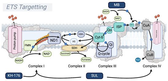 Pharmacological targeting of the electron transport system (ETS) to modulate mitochondrial function. The schematic depicts the mitochondrial ETS, highlighting key respiratory complexes (I–IV) and pharmacological interventions aimed at modulating oxidative phosphorylation. Electrons enter the chain via Complex I and Complex II, where ubiquinone (UQ) is reduced to ubiquinol (UQH2), and subsequently transfers electrons to Complex III. Cytochrome C (Cyt C) then facilitates electron transfer to Complex IV, where oxygen is reduced to water, driving ATP production. Methylene Blue (MB) acts as an alternative electron carrier by directly oxidizing NADH and reducing Cyt C, effectively bypassing Complex I and Complex III to prevent excessive ROS formation while enhancing oxidative phosphorylation. KH176 restores the mitochondrial redox balance by targeting Complex I, thus modulating oxidative stress through the thioredoxin/peroxiredoxin system. SUL compounds enhance the activity of both Complex I and the Complex III–Cyt C–Complex IV supercomplex, improving ATP production and preserving mitochondrial function under stress conditions. These pharmacological interventions hold promise for mitigating mitochondrial dysfunction in aging, neurodegenerative diseases, and ischemia–reperfusion injury.
