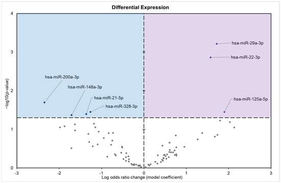 Differential expression analysis of conserved miRNAs in the pancreatic tissue of I. tridecemlineatus. Volcano plot of the differential expression of conserved miRNAs showing −log10(p value) versus the log2(fold change) for individual miRNAs in pancreas from hibernating squirrels versus the control group. Enriched terms are considered significantly altered if the FDR adjusted p-value is <0.05 and fold change > 1.5. Negative model coefficients depicting decreased expression are shown as blue circles in the blue-shaded box (left), whereas coefficients depicting increased expression are shown by purple dots in the purple-shaded box (right), and grey points represent non-significant miRNAs.