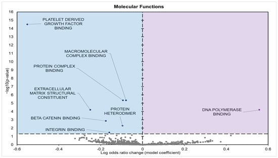 Volcano plot demonstrating the enrichment of GO molecular function (GO MF) through a logistic regression-based gene set analysis of the mRNAs predicted to interact with differentially expressed (DE) miRNAs in squirrel pancreas during hibernation. Enriched terms are considered significantly altered if the FDR-adjusted p-value is <0.01 and fold change > 1.5. All other information is presented as in Figure 1.