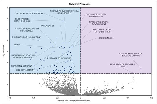 Volcano plot demonstrating the enrichment of GO biological processes (GO BPs) through a logistic regression-based gene set analysis of the mRNAs predicted to interact with DE miRNAs in squirrel pancreas during hibernation. Enriched terms are considered significantly altered if the FDR-adjusted p-value is <0.01 and fold change > 1.5. All other information is presented as in Figure 1.