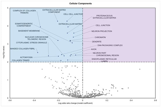 The potential impact of these miRNA changes can be predicted using gene set analysis of both the GO terms and KEGG pathways affected. GO analysis indicated a marked suppression of terms associated with active cell signaling, adhesion, structural remodeling, and proliferation processes (Table A1). Analysis of GO molecular functions (MFs) revealed the downregulation of terms such as platelet-derived growth factor binding, protein and macromolecular complex binding, and extracellular matrix structural constituents. These terms are often viewed as integral to mediating cellular interactions (Figure 2). Similarly, GO biological process (BP) terms related to gene expression, including chromatin assembly, aging, vascular development, and cellular development processes, were repressed. Typically, these processes are engaged during periods of growth and repair (Figure 3). Downregulated GO cellular component (CC) terms included extracellular matrix components, cell–cell junctions, basement membrane, and somatodendritic compartments, terms involved in actively organizing and stabilizing tissue structure and facilitating intercellular communication (Figure 4).