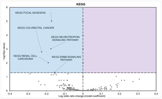 Volcano plot demonstrating the enrichment of KEGG pathways through a logistic regression-based gene set analysis of the mRNAs predicted to interact with DE miRNAs in 13-lined ground squirrel pancreas tissue during hibernation. The KEGG pathway is considered significantly altered if the FDR-adjusted p-value < 0.05. All other information is presented as in Figure 1.