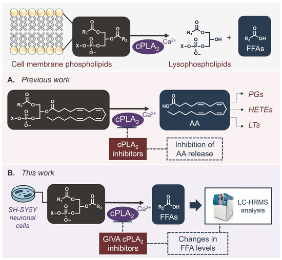 Enzymatic hydrolysis of glycerophospholipids by GIVA cPLA2. Generation of arachidonic acid and inhibition of its release by GIVA cPLA2 inhibitors (previous work, (A)). Study of intracellular FFA levels, following treatment of SH-SY5Y cells with GIVA cPLA2 inhibitors, by liquid chromatography–high-resolution mass spectrometry (this work, (B)).