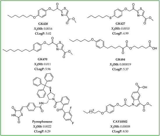 Structures of GIVA cPLA2 inhibitors used in this work, together with their XI(50) and ClogP values [22,27,28,29,30,31].