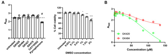 SH-SY5Y cells were seeded in sterile tissue culture 96-well plates at a density of 10,000 cells per well. After 24 h, the medium was removed and replaced with fresh media containing 3.5 μΜ of each inhibitor, and the cells were further incubated for 24 h at 37 °C. DMSO was used as a vehicle at ≤0.03% (the maximum concentration, 3.5 μM, corresponds to 0.03% DMSO). The culture medium containing the compounds (or DMSO) was removed, and 100 μL of 0.5 mg/mL MTT reagent (Applichem, Darmstadt, Germany) diluted in RPMI medium was added to the cells for 3 h at 37 °C. After 3 h incubation, MTT was removed and 200 μL of DMSO was added. Absorbance values of formazan were measured at 540 nm using a BioTek Synergy H1 microplate reader (Agilent, Santa Clara, CA, USA). All compounds were tested in triplicate. For the nonlinear regression analysis, various concentrations of GK420 and GK484 (1.0, 3.5, 7.0, 15, 25, 45, 65, 85, 115, and 135 μΜ) were tested with the MTT assay as described above. The results were statistically analyzed using GraphPad PRISM Version 9 (GraphPad Software, Boston, MA, USA) to extract IC50 values.