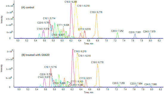 SH-SY5Y cells were treated with each GIVA cPLA2 inhibitor at a concentration of 3.5 μM for 24 h, and compared with cells treated with DMSO as vehicle. DMSO alone had no effect on cell viability. None of the synthesized inhibitors were cytotoxic at this concentration, as confirmed by the MTT assay (Figure 3A). Only pyrrophenone showed a small reduction in cell viability (Figure 3A). It must be noted that pyrrophenone is usually used in cell experiments at concentrations up to 2 μM [33,34]. Furthermore, for two selected inhibitors, thiazolyl ketone GK420 and 2-oxoester GK484, the IC50 values were estimated and found to be 118.1 μM and 81.7 μM, respectively (Figure 3B). No other changes in cell morphology were observed after a 24 h incubation with the inhibitors. Following treatment, the cells were lysed, and the lysates were extracted by chloroform/methanol (4/1 v/v) and used for analysis. An LC-HRMS method previously developed by us for the determination of FFAs [26] was applied, and the contents of 24 FAs (medium-chain and long-chain, saturated and unsaturated) were measured both in control samples and samples treated with the inhibitors. Figure 4 illustrates extracted ion chromatograms (EICs) of FFAs in a representative control sample of SH-SY5Y cells (A) and a representative sample treated with inhibitor GK420 (B). EICs of FFAs in representative control samples of SH-SY5Y cells and samples treated with either inhibitor GK427 or inhibitor GK484 are depicted in Figures S1 and S2 (Supplementary Materials), respectively.