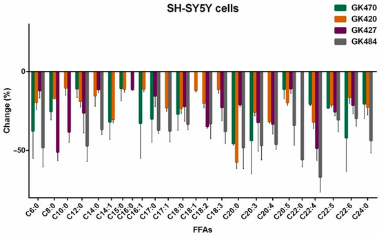 Change in intracellular FFAs upon treatment of SH-SY5Y cells with thiazolyl ketone (GK470, GK420, GK427) and 2-oxoester (GK484) inhibitors.
