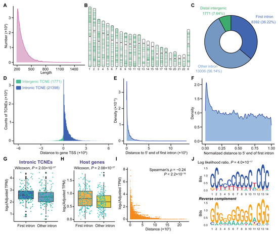 The landscape of TCNEs in breast cancer. (A) Size distribution of TCNEs. (B) Genome-wide overview of the location of TCNEs identified in our breast cancer cohort. (C) Genomic location distribution of TCNEs. (D) Distribution of distances from the intronic TCNEs to the host gene TSS (blue) or the intergenic TCNEs to the nearest gene TSS (green). (E) Physical distance, or (F) normalized distance, from the middle points of TCNEs located in the first intron to the host gene TSSs. Comparison of transcription levels of (G) intronic TCNEs, or (H) host genes, located in the first intron and other introns. (I) The correlation between the expression levels of host genes and the distance from TCNEs to host gene TSSs. (J) A significantly enriched motif for the first intronic TCNEs against the other intronic TCNEs.