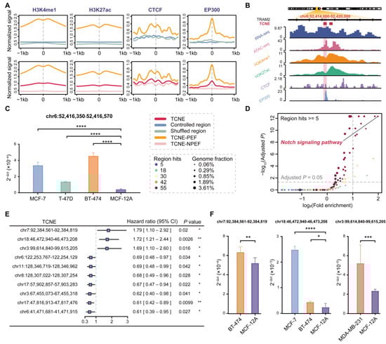 Characterization of TCNEs based on putative enhancer features. (A) Comparison of histone modification marks (H3K4me1 and H3K27ac), CTCF signal, and EP300 signal between TCNEs (red) and controlled regions (blue)/shuffled regions (green) or TCNEs with putative enhancer features (orange) and TCNEs without putative enhancer features (pink) at 1000 bp each upstream and downstream. TCNE-PEF: TCNEs with putative enhancer features. TCNE-NPEF: TCNEs with putative enhancer features not previously identified in publications. (B) A typical example of TCNEs located within TRAM2 enriched for multiple signals. (C) qPCR analysis of the TRAM2-TCNE in four cell lines. (D) Functional annotation of TCNEs with putative enhancer features. (E) Forest plot of ten TCNEs as independent clinical prognostic factors. (F) qPCR analysis of these three TCNEs, which were considered as risk factors, in multiple cell lines. * p < 0.05, ** p < 0.01, *** p < 0.001, and **** p < 0.0001.