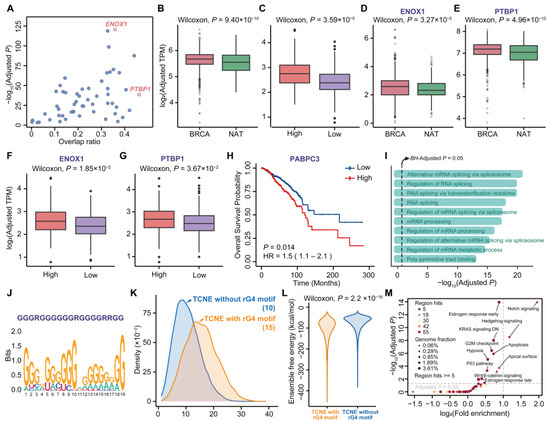 Sequence patterns and structural features of TCNEs in breast cancer. (A) Distribution of TCNEs enriched with the corresponding quantity of RBP motifs; overlap ratio represents the percentage of sequences enriched with motifs. Differences in average expression levels of (B) twenty RBPs, (D) ENOX1, and (E) PTBP1, between breast cancer (BRCA) and normal tissues adjacent to the tumor (NAT) from TCGA and GTEx. Differences in average expression levels of related TCNEs between high and low expression groups of (C) twenty RBPs, (F) ENOX1, and (G) PTBP1. (H) Kaplan–Meier survival plots of PABPC3. (I) GO enrichment analysis for twenty RBPs. (J) RNA G-quadruplex motif discovered in transcripts of TCNEs. (K) Comparison of RBP-enriched counts, and (L) comparison of ensemble free energy between TCNE with rG4 motif and TCNE without rG4 motif. (M) Function annotation of TCNEs with rG4 motifs.