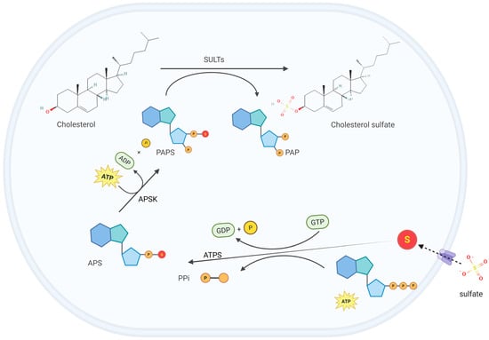 CS is synthesized in a variety of tissues, such as the epidermis, red blood cells, and platelets. The production rate of CS has not been precisely determined, but it is estimated to be approximately 45 mg/day, comparable to that of dehydroepiandrosterone (DHEA) sulfate in the bloodstream [4]. The biosynthesis of CS involves two main steps: the activation of inorganic sulfate and the sulfonation of cholesterol mediated by sulfotransferases (SULTs) (Figure 1). Dietary-derived sulfate, an essential micronutrient, undergoes intestinal absorption through specific sulfate transporters. Following cellular uptake, sulfate activation initiates through ATP sulfurylase (ATPS) activity within the bifunctional 3′-phosphoadenosine 5′-phosphosulfate (PAPS) synthase complex [6]. This enzymatic reaction transfers the adenosine monophosphate (AMP) moiety from ATP to sulfate, generating adenosine-5′-phosphosulfate (APS), characterized by a high-energy phosphoric–sulfuric acid anhydride bond crucial for sulfate activation [7]. Subsequently, the APS kinase (APSK) domain of PAPS synthase phosphorylates APS at the 3′-position to yield the universal sulfate donor PAPS. The final sulfonation step is mediated by sulfotransferases (SULTs) that transfer the activated sulfate group from PAPS to the 3β-hydroxyl group of cholesterol, ultimately producing CS [8].