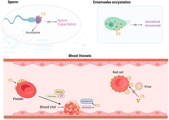 CS functions as a component in biological membranes. In the sperm plasma membrane, primarily in the acrosomal region, the hydrolysis of CS can lead to membrane destabilization and trigger motility events. In Entamoeba encystation, CS dose-dependently induces and maintains encysting cells as spherical maturing cysts, with almost no phagocytotic activity. In platelets, CS binds to the membrane and enhances ADP (Adenosine diphosphate)- and thrombin-induced platelet aggregation and serotonin secretion. CS is also a potent inhibitor of Sendai virus fusion to erythrocyte membranes. This figure was created in Biorender. Yu, X. (2025) https://BioRender.com/oaeglkg (accessed on 10 March 2025).
